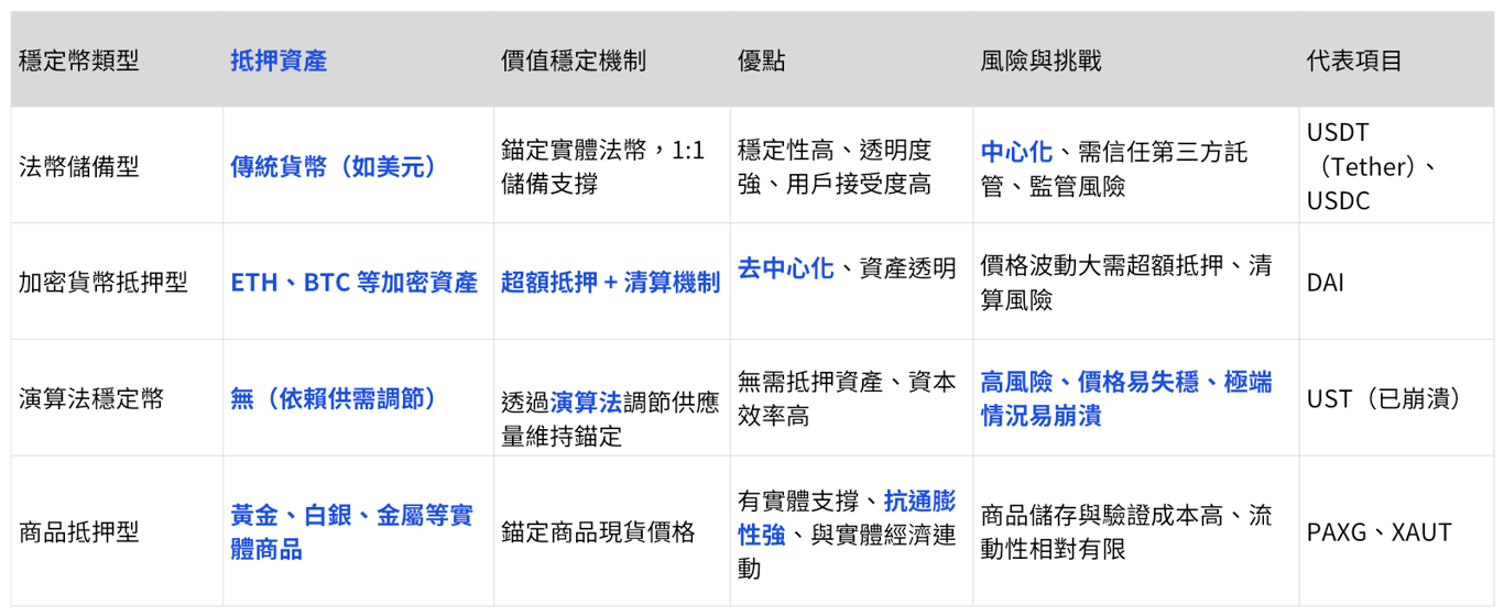 若依抵押機制分類,穩定幣可分為四類:法幣儲備型、加密抵押型、演算法型、商品抵押型。其中,剛剛提到的 USDT 與 USDC 均屬於法幣儲備型。不同類型各有優勢與風險,例如去中心化的演算法穩定幣雖具創新性,卻可能因機制失衡而造成崩盤。