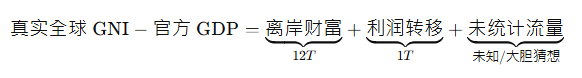 全球 GNI – 全球 GDP>0保守估值支撑:Piketty、Zucman 等研究 → GNI/GDP ≈ 1.12–1.15