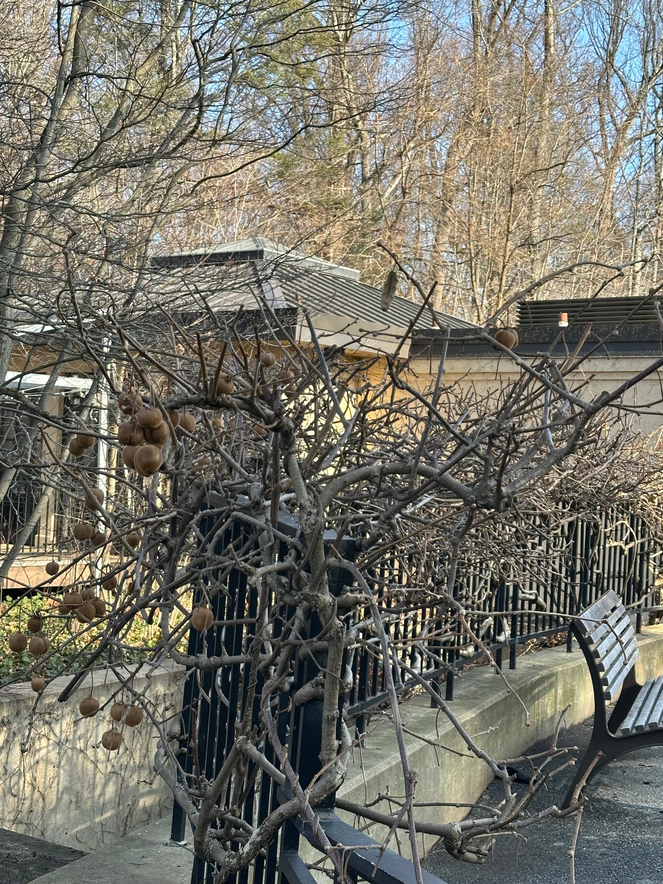 走到餐厅的另一边的门口,我的乖乖,那些奇异果的叶子都掉光了。枝上就挂了一个个的奇异果果实。不过大多数的个头都不大。看这样子公园是不会采摘,着实是浪费了。好想摘一个下来尝尝…