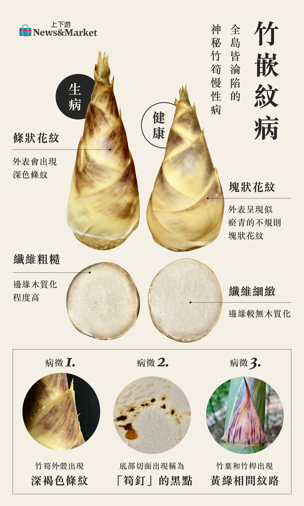 認真說起來,竹嵌紋病毒對竹產業「問題不大又很大」。台灣竹筍多產於夏季,且生產技術純熟,是重要經濟作物之一。然而竹子感染竹嵌紋病毒後,會加速竹筍纖維變粗,不僅口感變差,「產量還會降低約 50%」。但因為竹嵌紋病毒不會造成竹子死亡,多數竹農在應對上較不積極。