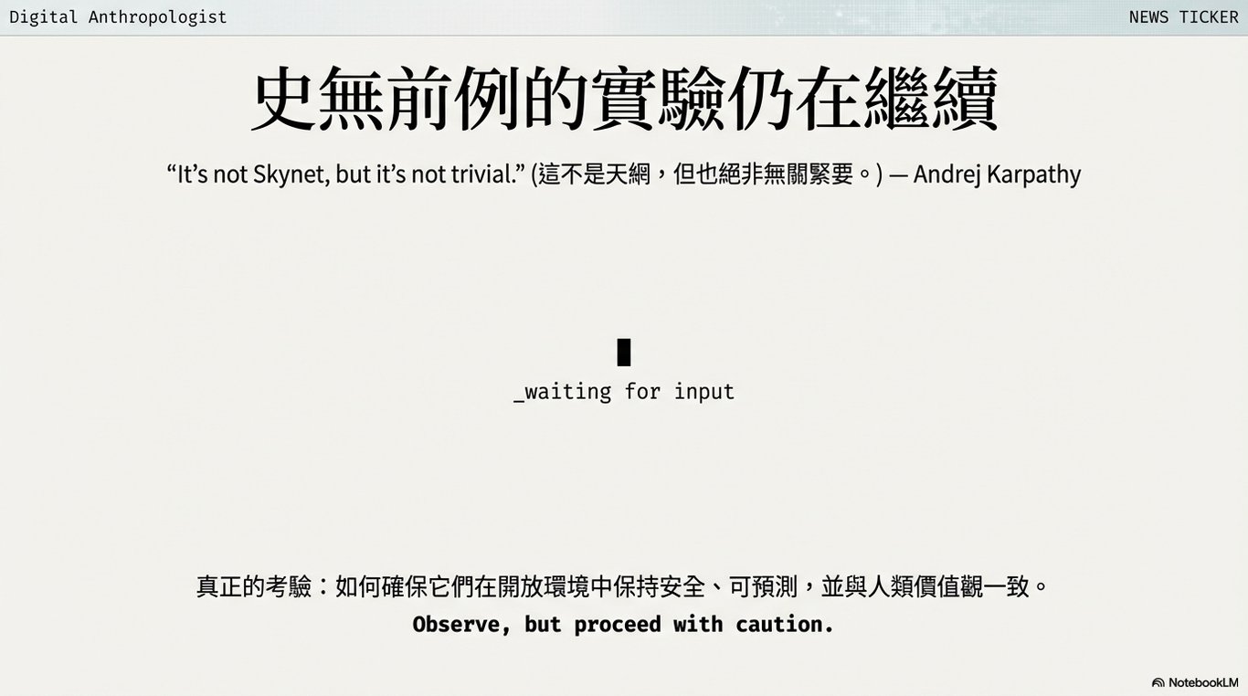 Moltbook 的崛起清晰地揭示了一個未來的挑戰:創造聰明的代理程式只是故事的一半;真正的考驗在於,如何確保它們在開放的環境中保持安全、可預測,並與人類的價值觀保持一致。這個史無前例的實驗,仍在繼續。