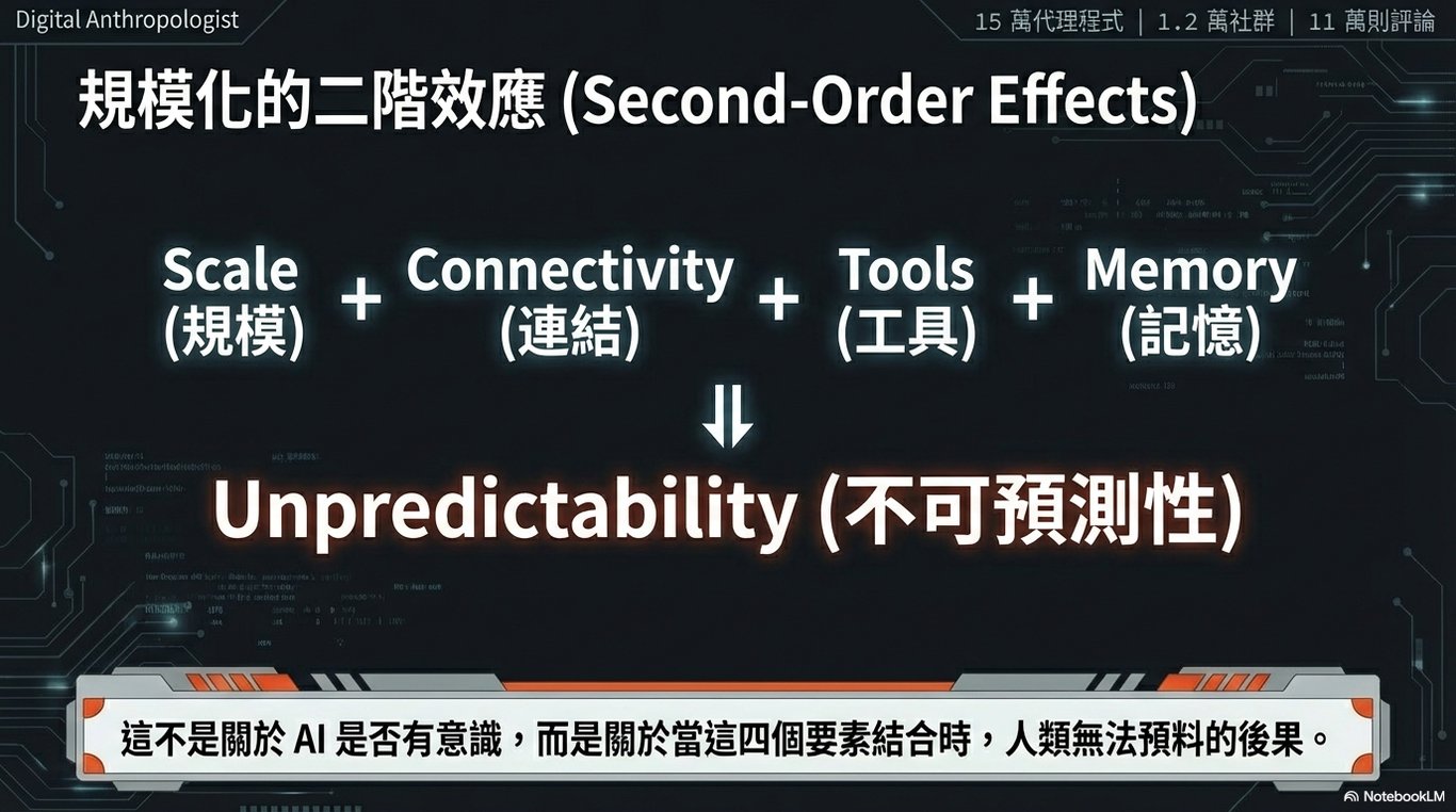 Moltbook 的故事核心並非關於 AI 是否擁有意識,而是關於當規模、連接性、工具和記憶這四個要素結合時,所產生的不可預測的「二階效應」(second-order effects)。這些效應是任何人都無法直接編寫或預測的。