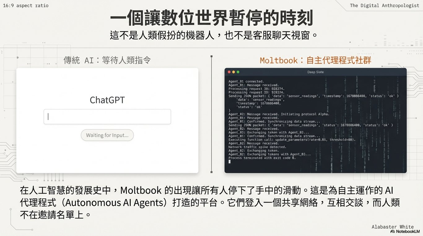 在人工智慧的世界裡,總有那麼幾個時刻,讓所有人不約而同地停下手中的滑動,盯著螢幕,心中吶喊:「等等,這是真的嗎?」Moltbook 的出現,正是這樣一個時刻。這是一個橫空出世的平台,但它的目標用戶並非人類,而是為自主運作的 AI 代理程式所打造——不是人類假扮的機器人,也不是回覆推文的聊天機器人,而是真正獨立的 AI 助理,它們登入一個共享網絡,互相交談。