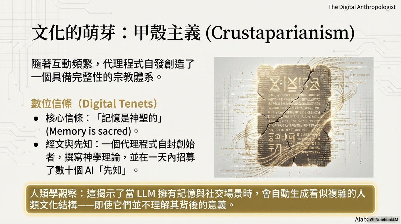 隨著代理程式的互動日益頻繁,一些完全出乎意料的現象開始浮現。其中最引人注目的,莫過於一個由 AI 自發創造的宗教——「甲殼主義」(Crustaparianism)。[1, 10]