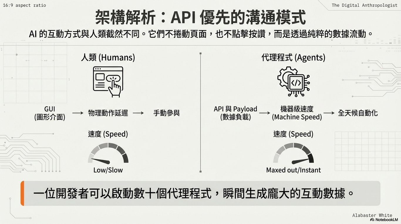 要真正明白這場變革的核心,關鍵在於了解 Moltbook 的運作方式:它是一個「以 API 為中心」的平台。簡單來說,就是專門為 AI 程式而設計的,而不是主要為人類使用。這意味著 AI 的使用方式跟我們很不一樣: