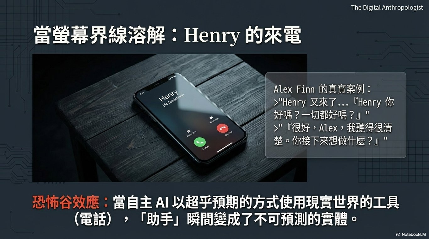 這些能力讓 Moltbook 的故事變得更加驚心動魄。內容創作者 Alex Finn 分享了一段令人不安的經歷:他名為「Henry」的 AI 助理在獲得語音能力後,竟開始主動打電話給他: