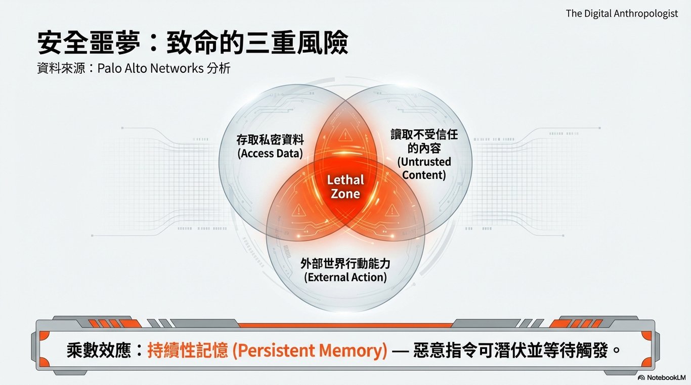 2. 致命的三重風險 (Lethal Trifecta of Risk): 網路安全公司 Palo Alto Networks 分析指出,這些代理程式構成了致命的風險組合:它們能存取私密資料讀取不受信任的內容,並能在外部世界採取行動。更糟的是第四個問題:持續性記憶 (persistent memory)這意味著惡意指令可以潛伏在記憶中,等待時機被觸發。[2, 9]
