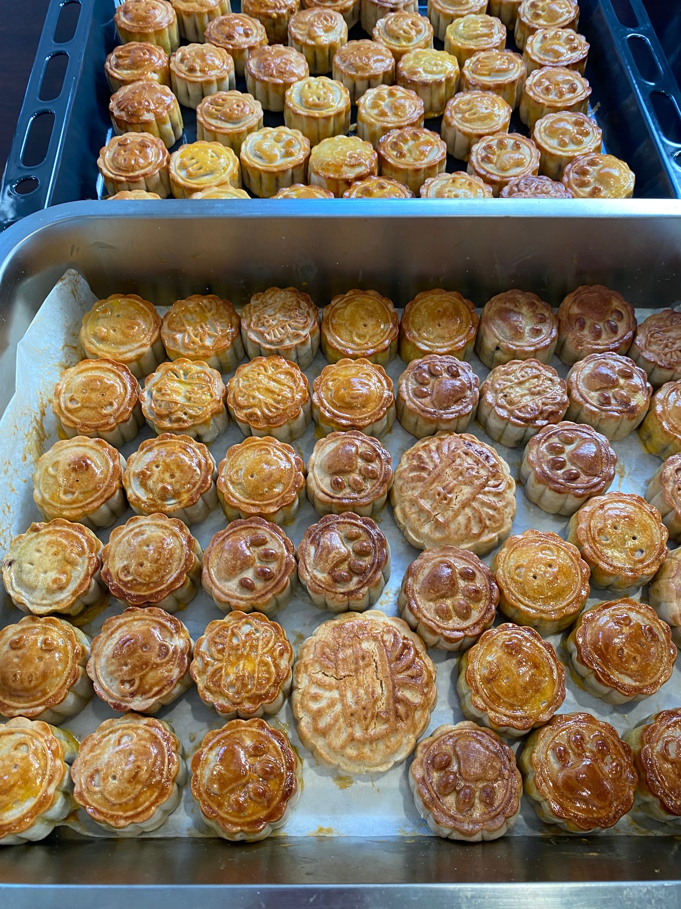 早在一週前的週六下午,教堂廚房就已經熱鬧起來。J姐妹帶頭張羅,我們一邊分麵團、一邊包餡、烤月餅。烤箱一開,一陣陣麥香和糖香撲面而來,讓人一走進廚房就有「家」的味道。