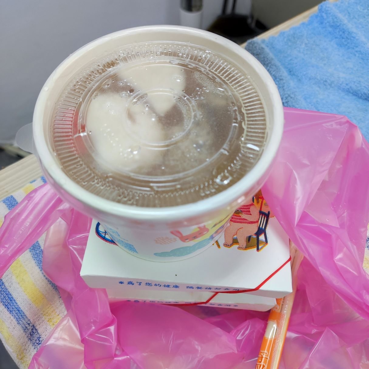 一過去..,阿姨說她已經幫我買好午餐...,碗粿、燙地瓜葉與苦瓜湯..。