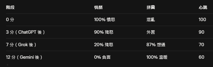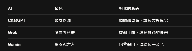 ChatGPT 先倒垃圾 → Grok 冷血理清 → Gemini Storybook 溫暖收尾。