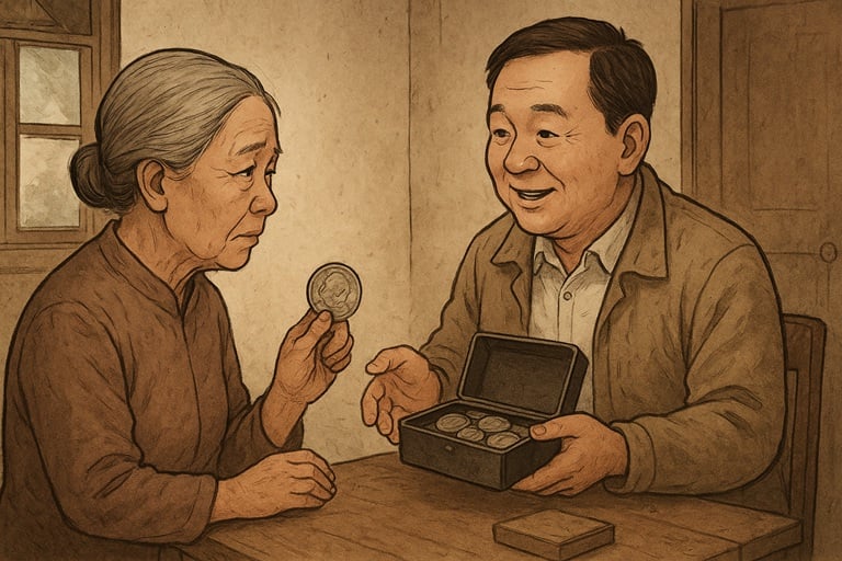 今天去送藏品拍賣時,聽到一位專門收購的中年男子談起,他常跑南部與老眷村,低價收購早期銀幣——像袁大頭、帆船、日本龍銀等。他說自己「一口價一枚八百」,若銀幣包漿嚴重,還會用「不值錢」的話術哄遺孀降價。