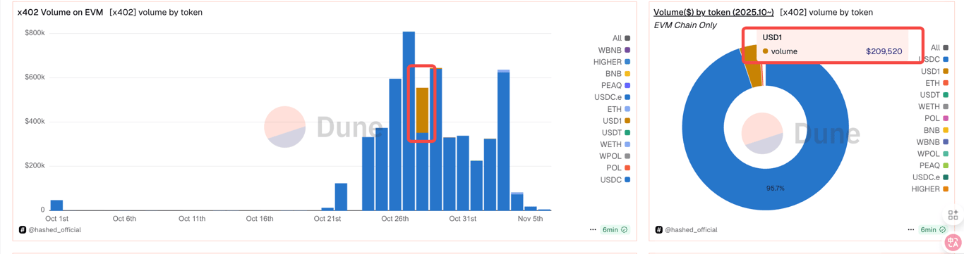 看代币分布更能说明问题。整个 x402 生态 98.7%的交易额用的是 USDC,剩下的 1.3%分散在 USD1、USDT、ETH 等十几种代币上。