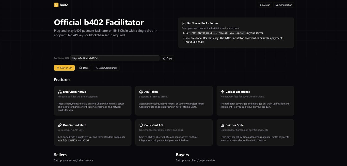 对开发者来说,接入 b402 Facilitator 极其简单。在服务器配置里加一行 “FACILITATOR_URL=facilitator.b402.ai”,你的 API 就能开始向 AI Agent 收费。不需要懂区块链,不需要管理私钥,b402 会处理所有技术细节。