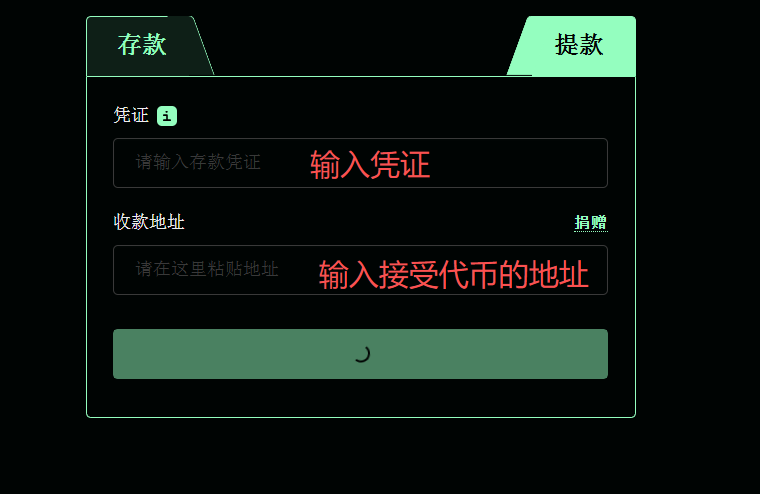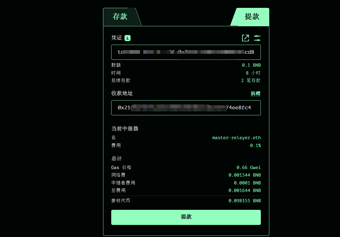 在取款页面输入凭证秘钥,以及接受代币的钱包,系统会获取凭证数据,并查找中继器
