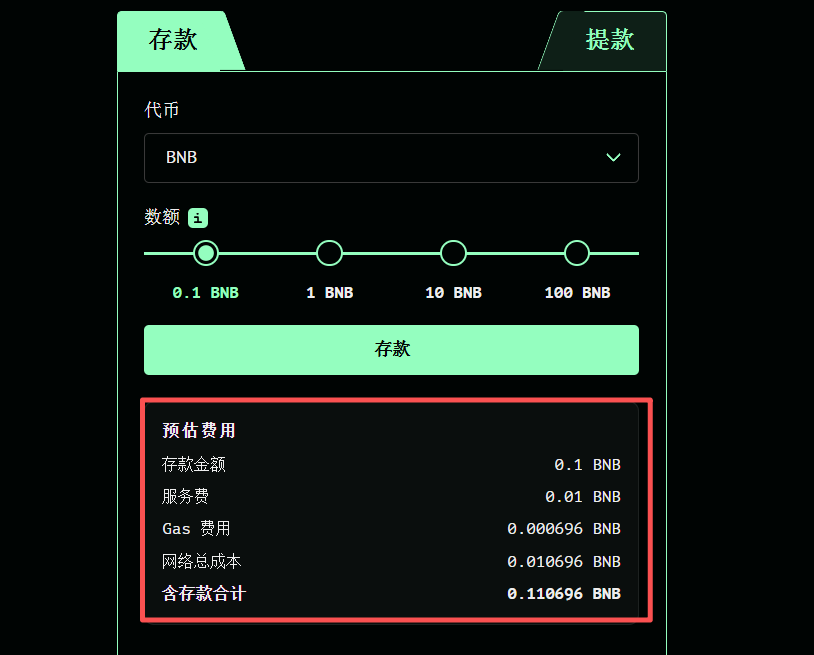 接下来,你就可以选择要存入的代币金额。目前只支持BNB存款,一共有4个金额,分别是:0.1BNB、1BNB、10BNB以及100BNB。