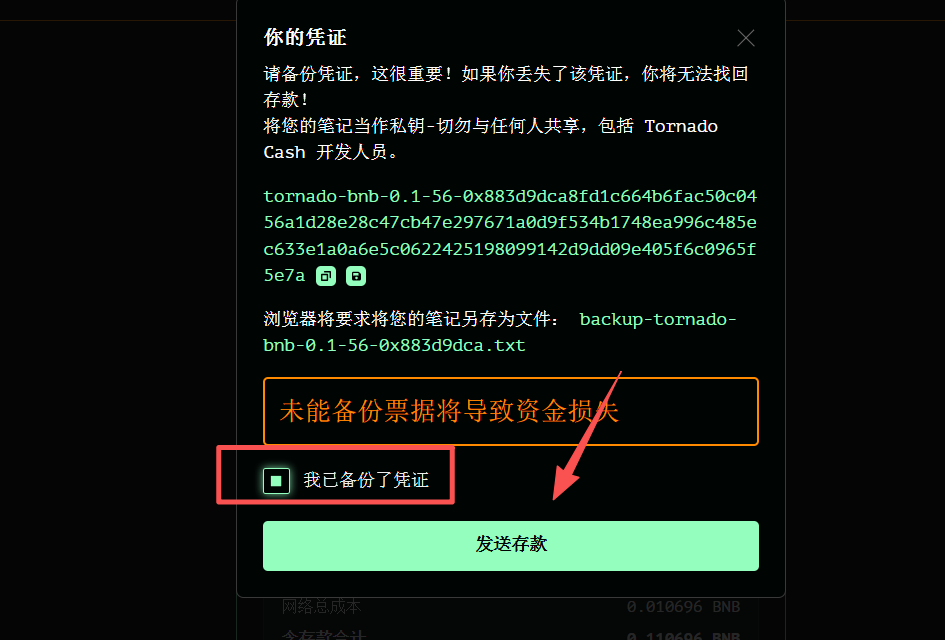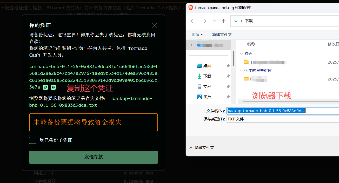 在你点击存款之后,浏览器会提示要让你备份(复制)凭证,同时下载一个文档作为备份。