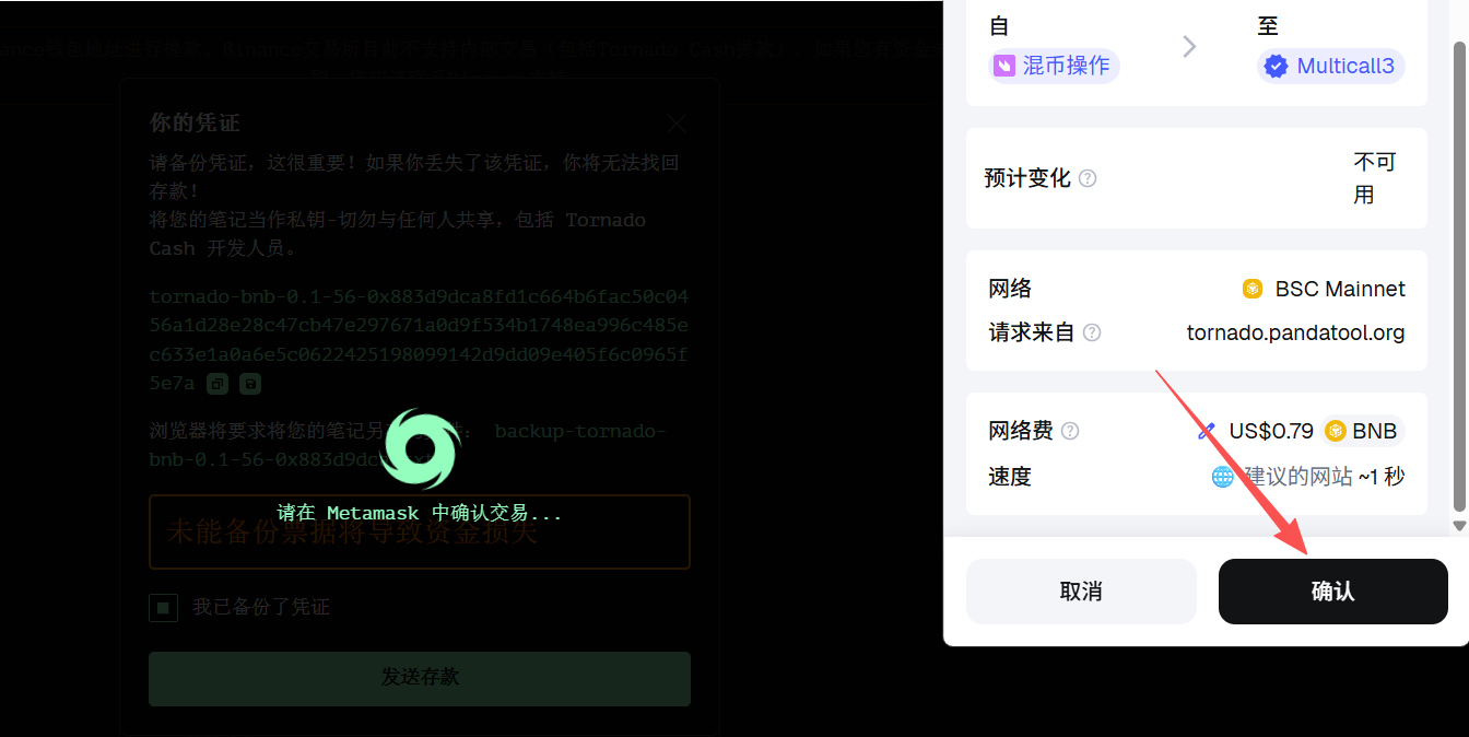 按照要求存入固定金额的代币(如0.1BNB或者1BNB),连接钱包把钱投进去。系统在你浏览器里生成一个凭证秘钥,同时下载一个作为备份。你需要将这个秘钥妥善保存好,作为你的取款凭证。