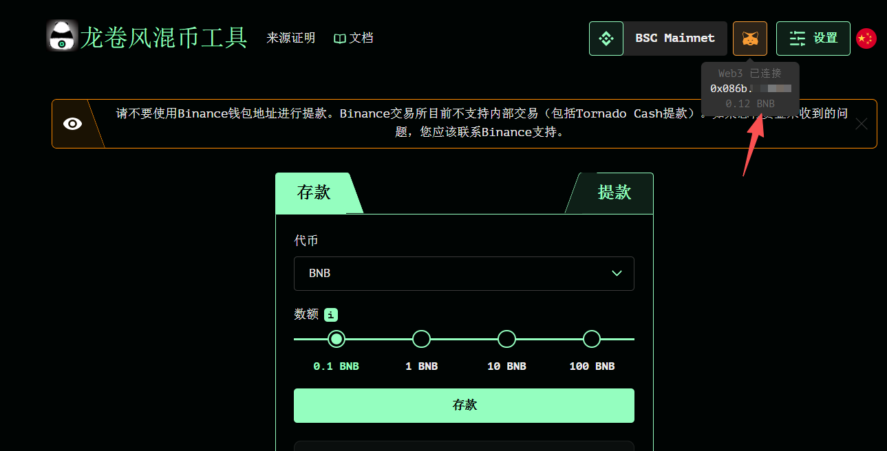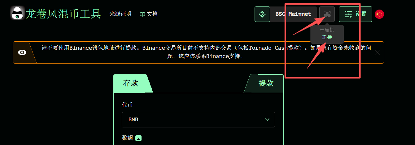 首先,我们需要在电脑浏览器(或者是手机钱包里)打开PandaTool混币工具:https://tornado.pandatool.org/ 之后,点击右上角连接钱包
