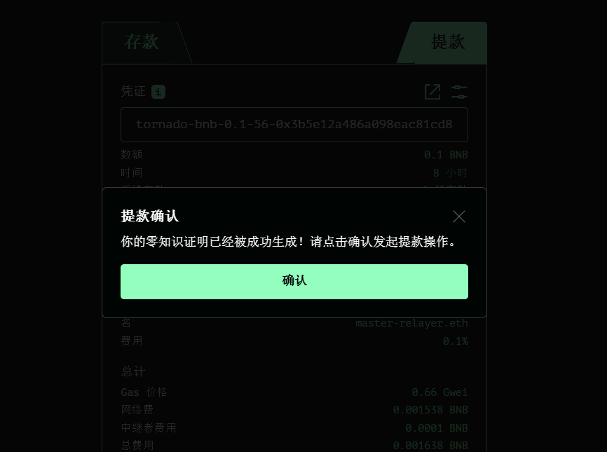 点击提款按钮后,再等待1到3分钟,混币器会核对您的凭证,让你再次确认