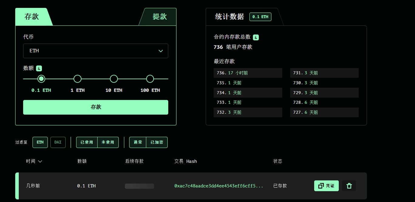 它用零知识证明(zk-SNARKs)让人把钱存进一个“池子”,再从另一个地址取出,从而在链上切断「谁把钱给了谁」的直接可见关联,达到隐私保护的效果。