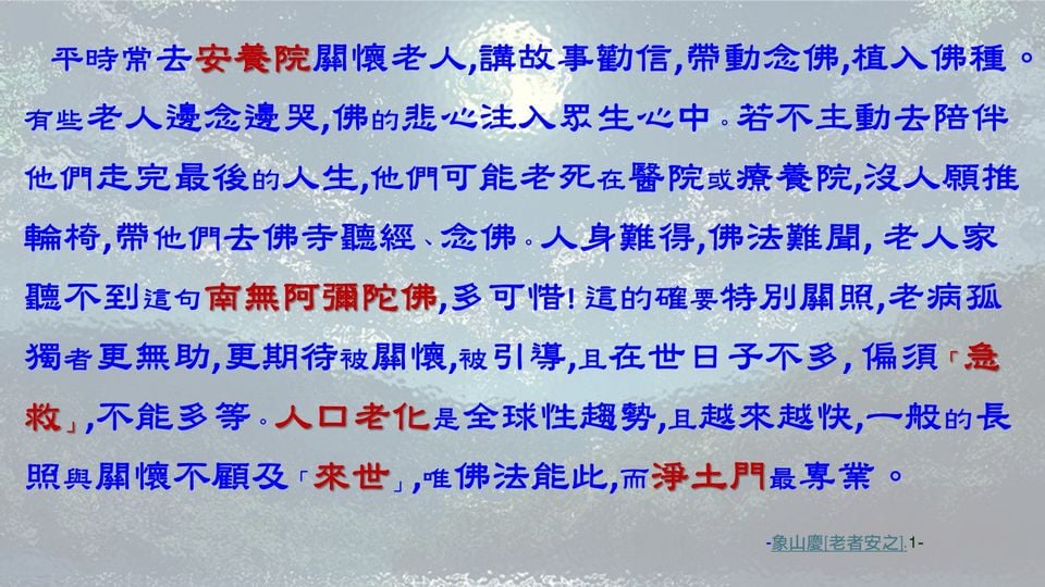 有人說:到養護中心「關懷」孤苦的老者們,遙想當年悉達多太子出四門,見「老病死」與「沙門」,而捨家修證「解脫道」而成佛的心情;也由此感恩彌陀較眾生「念佛往生」的大愛,我願走到人群中散播「佛號」金剛種子,勸請大衆念佛,離苦得樂!諸相緣起而無常,總是假,彌陀大悲之弘願,唯此真!念佛人信佛念佛,願生安樂!從此好好吃飯、好好睡覺、好好做人,遇苦當吃補、處樂則陶然,或清明或裝傻,自在安定,是何等幸福的「人中芬陀利花」呀!