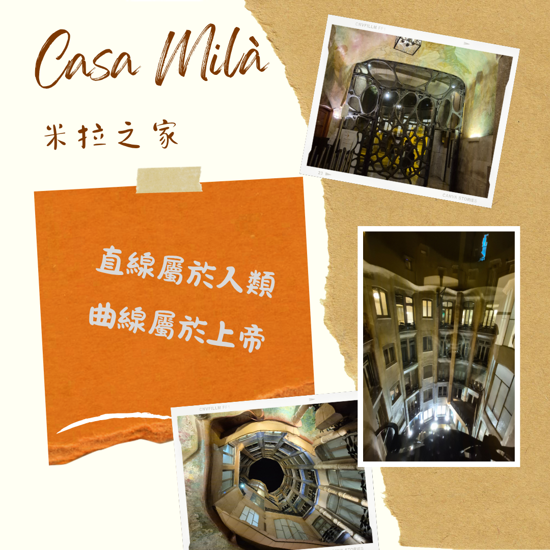 選擇的是英文導覽,對英文苦手的我就難以有共鳴,只能大概知道高第的設計喜愛從大自然找尋靈感,而且高第認為自然界裡並不存在純粹的直線,他曾說:「直線屬於人類,曲線屬於上帝。」難怪從大門開始、中庭四周望,一路沿著樓梯走去,會發現像是蝴蝶翅膀形狀的大門、牆壁彩繪像生機盎然的叢林,甚至是樓梯間的轉角、扶手,也很難找到直線,不禁嘖嘖稱奇、感到不可思議,剩下的只能等結束後再上網查 Casa Milà 的特色。