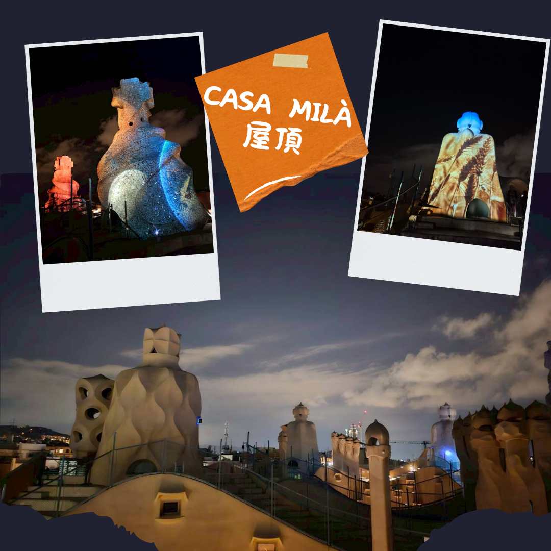 另外,頂樓天台的柱子(其實是煙囪、通風口、樓梯口)因為有燈光秀搭配,顯得神祕詭譎,沿四周散步展望,夜景一覽無遺,還可以看到遠處的聖家堂,第一個景點就能夠讓我拍得開心,更期待之後的景點啦。