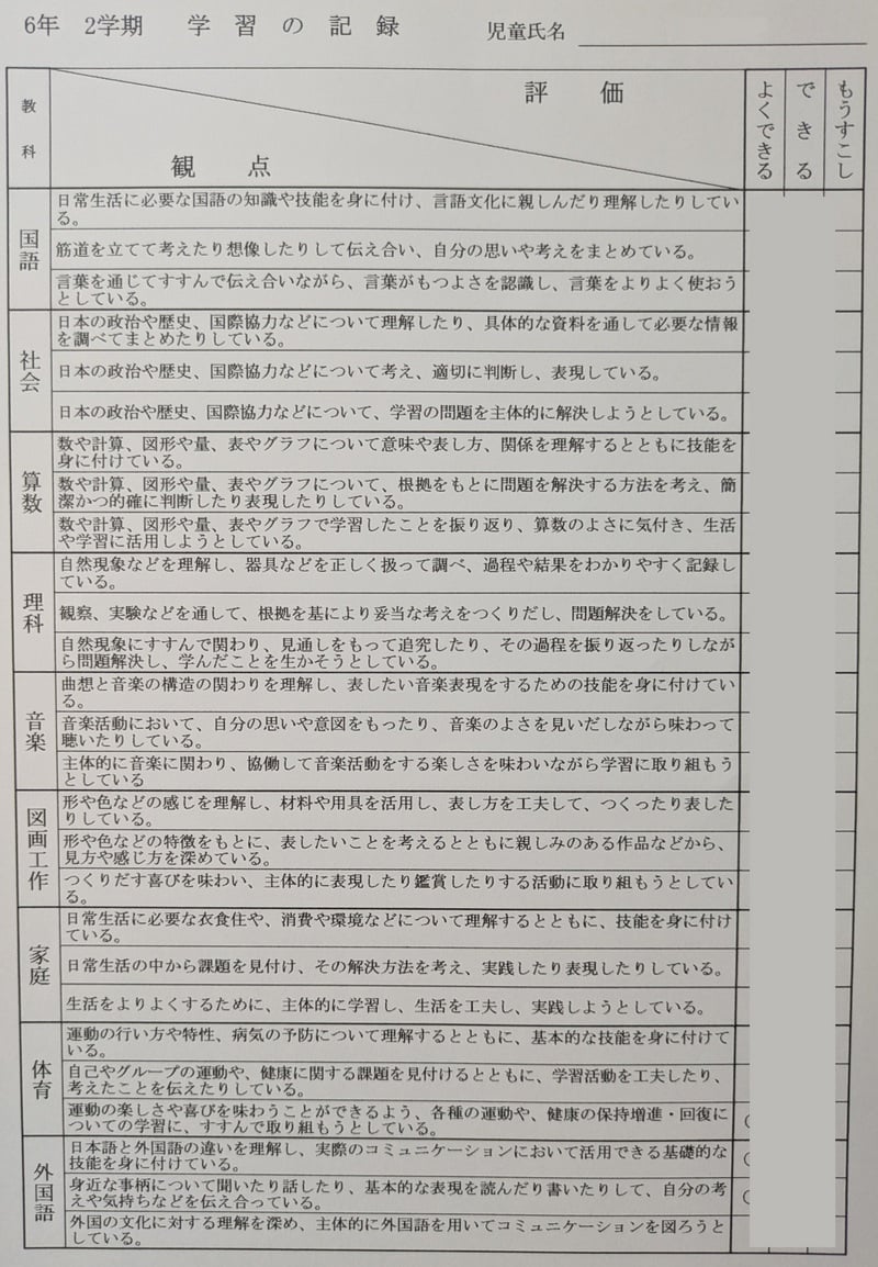 雖然平時也有小考,但學校的年度計畫中絕不會特地標註考試日期。每學期末領取的成績單,日文稱為「軌跡」(あゆみ),評價僅分為「優良」、「良」、「尚可」三階,參考下列附圖比較容易理解。家長若想了解孩子的具體排名,必須私下詢問導師,而導師也僅會提供一個大致的區間(如:前段或後段),絕不公開表揚或批評,極力維護每位學生的自尊與平等。