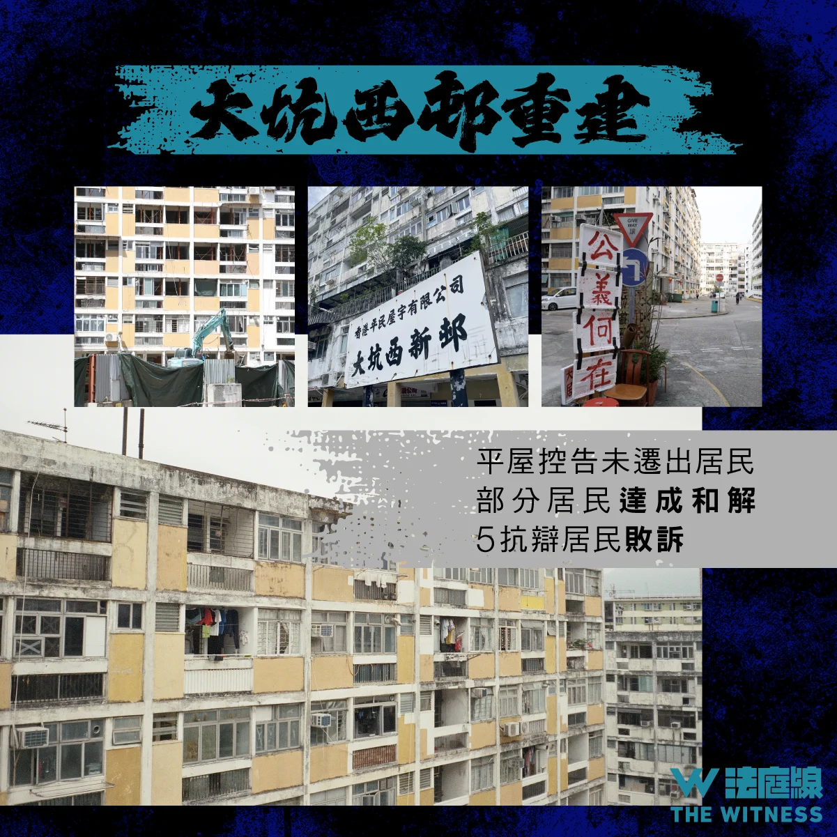 住屋方面,石硤尾大坑西邨將清拆重建,「平民屋宇有限公司」民事控告拒絕遷出居民,分成兩案處理。「平屋」與部分居民達成和解,5 名抗辯居民則全部敗訴。其中兩名居民另提司法覆核亦遭駁回。