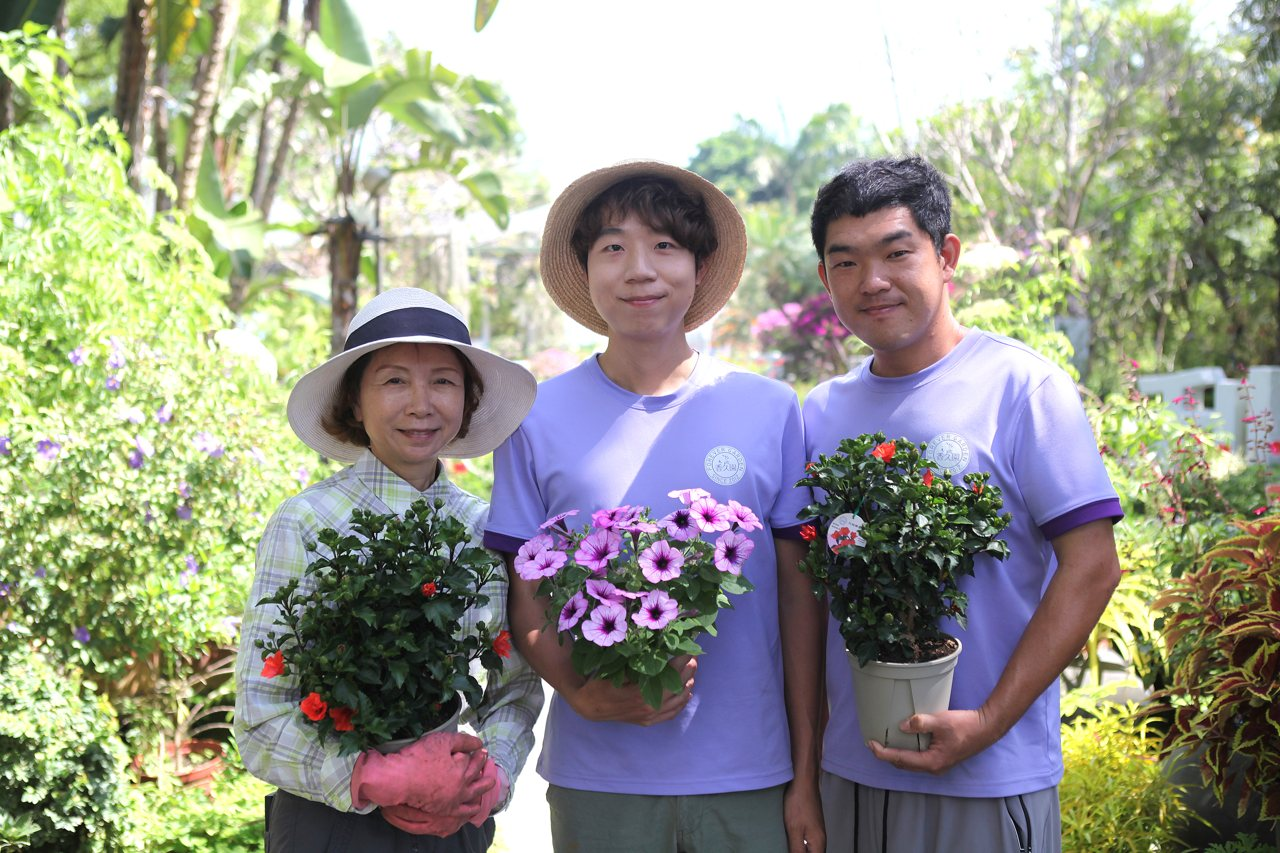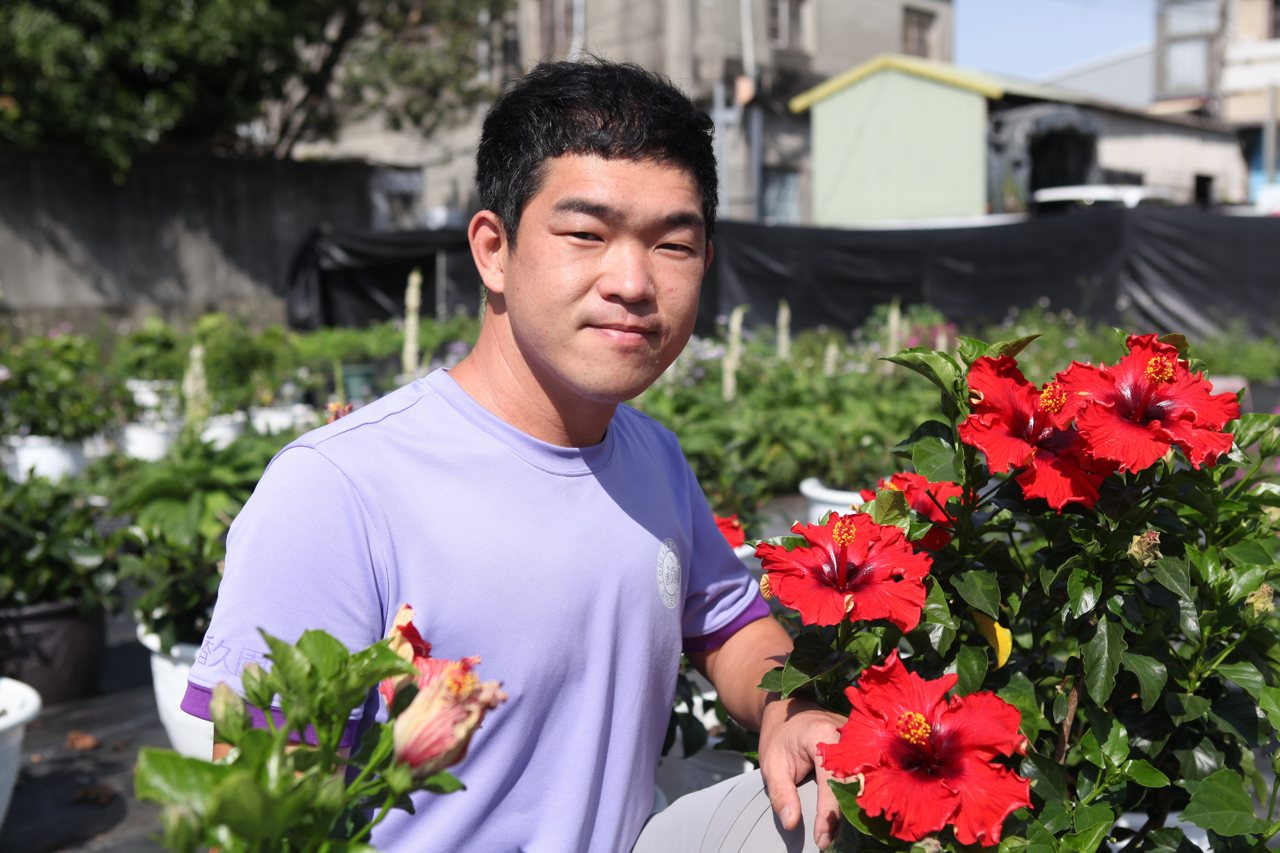固定向香久園採購的田尾合利園藝老闆高惠美表示,謝丞傑與匡易育出的朱槿、矮牽牛等花卉極具市場獨特性,許多客戶為了增加造景色彩多元性特別採購。加上他們用心打造自己形象既專業、又有美感,現在盆栽貼上香久園標誌,定價比較高也能順利售出。