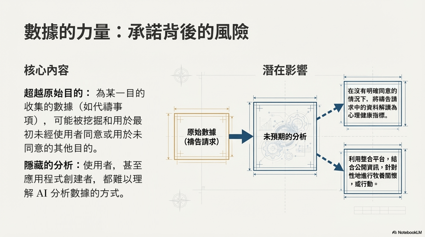 • 具體案例: 例如,信徒提供的代禱請求資料可能會被某些 AI 系統解讀為心理健康指標,這會讓許多單純尋求禱告支持的用戶感到驚訝與不安。