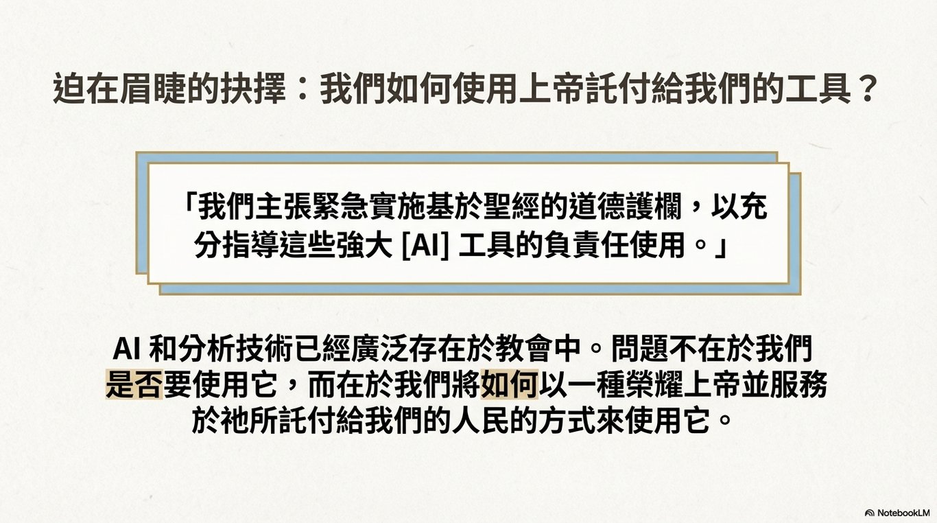 • 迫切性: 現在是採取行動的時候了。教會需要的是基於聖經的倫理護欄,而非繁重的規條。
