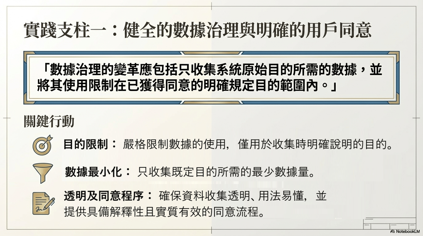 • 目的限制: 應僅收集原始系統目的所需的數據,並將其用途嚴格限制在用戶已明確同意的範圍內。
