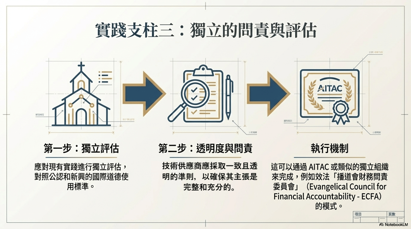 • 獨立評估: 應建立一個類似於「福音派財務問責委員會」(ECFA)的聯盟,對現行技術實踐進行獨立評估,要有最大的信任與接受度。
