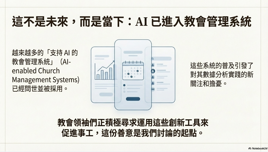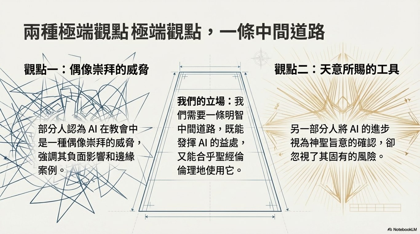 隨著越來越多具備人工智能(AI)功能的「教會管理系統」(Church Management Systems, ChMS)出現,教會內部對 AI 的使用產生了高度關注與分歧。目前存在兩種極端的觀點:一方將 AI 視為「偶像崇拜的威脅」,認為其本質邪惡且忽略了已有的益處;另一方則視其為「天意工具」(providential tool),認為批評者誇大了潛在的負面情景。為了尋求平衡,人工智能與信仰及問責聯盟(AITAC) 致力於推動一條中間路線,即在聖經基礎上有效地、倫理地使用這些不斷增長的 AI 功能。
