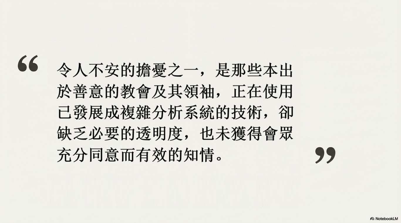 目前最令人擔憂的問題是,許多動機良好的教會及其領袖正在應用複雜的分析系統,卻缺乏必要的透明度或信徒的同意和知情權