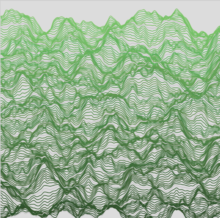 今天上課主要學的是 p5.js 裡的 noise,也就是所謂的 Perlin noise。原本我以為生成式藝術就是用亂數排排線、排排點,但今天發現 noise() 其實可以讓程式畫出「連續而自然」的變化,這種結果不像電腦隨機那樣生硬,而是帶有一種「有機感」,甚至有點像人手畫出來的筆觸或自然生成的紋理。