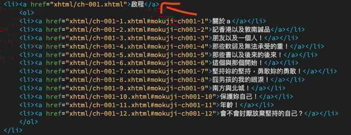 導覽列裡的所有選項都要有一個xhtml檔,不能隨便給「一行字」把幾篇文章縮在那一行字下之下。下圖的<a href=”xhtml/ch-001.xhtml”>啟程</a>裡的「href=”xhtml/ch-001.xhtml」就是要去連結一個xhtml檔。