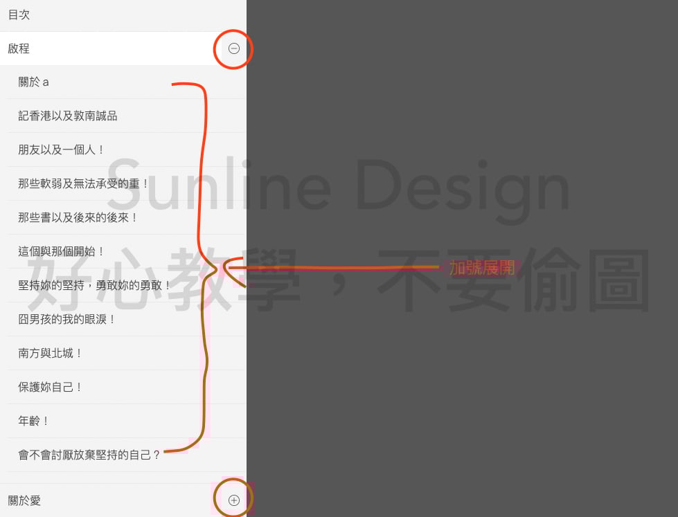 另一個注意事項是大多數編輯會犯的錯。如果你要做「+」這個功能展開所有內文的話,像書名頁做後「+」就要跟著內文!