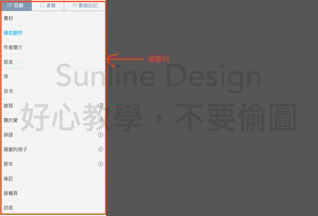 原則上純文字書用不太到「目錄」這個選項,所以是直接做在「導覽列」,如果你紙書有「落版單」的概念,導覽列就是電子書的落版單!