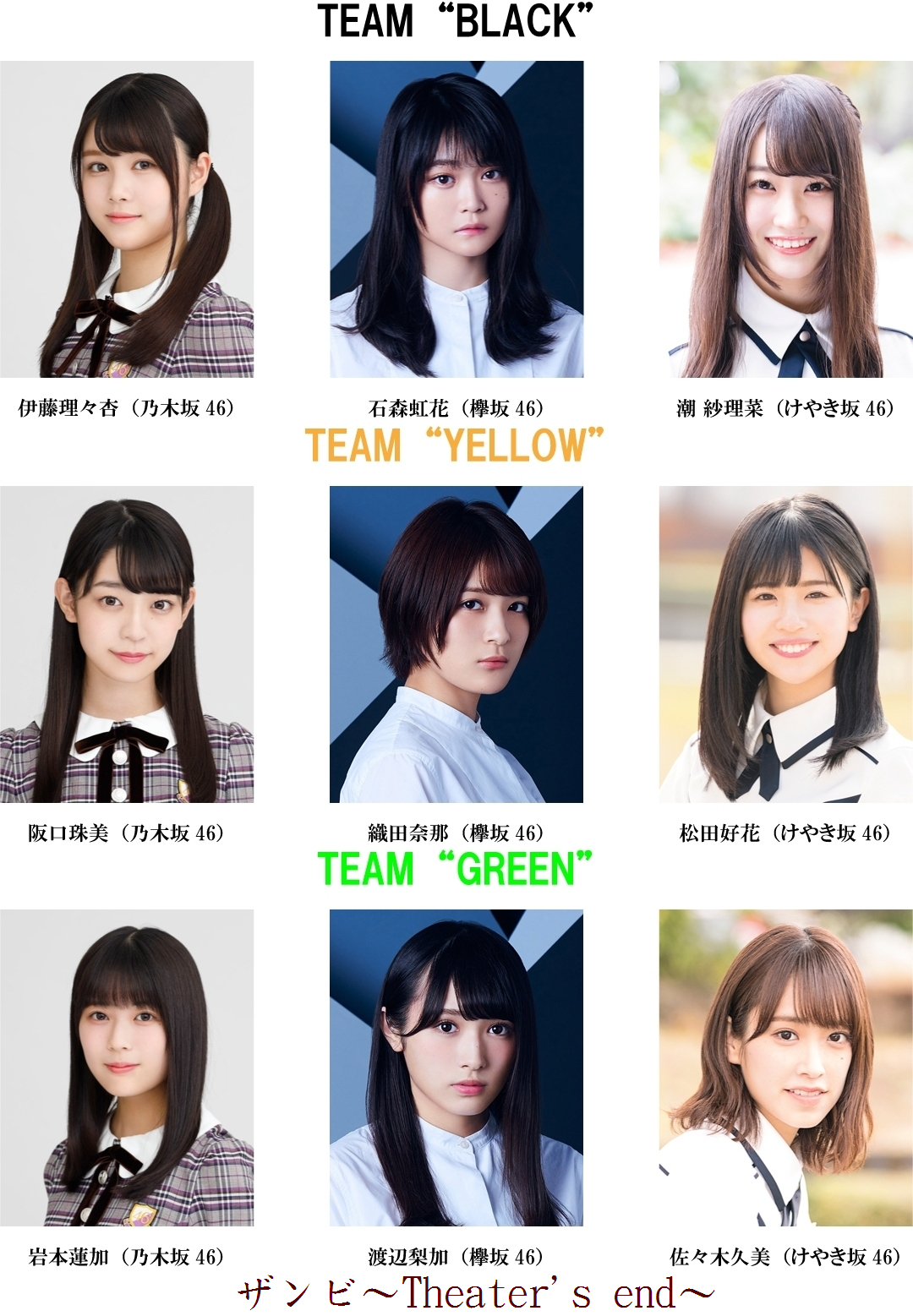 殘美企劃第三彈,舞台劇「ザンビ~Theater's end~」於天王洲銀河劇場公演。由坂道三團各派三位成員參演,當中分作TEAM BLACK(伊藤理々杏、石森虹花、潮紗理菜)、TEAM YELLOW(阪口珠美、織田奈那、松田好花)、TEAM GREEN(岩本蓮加、渡辺梨加、佐々木久美)三組分場演出。