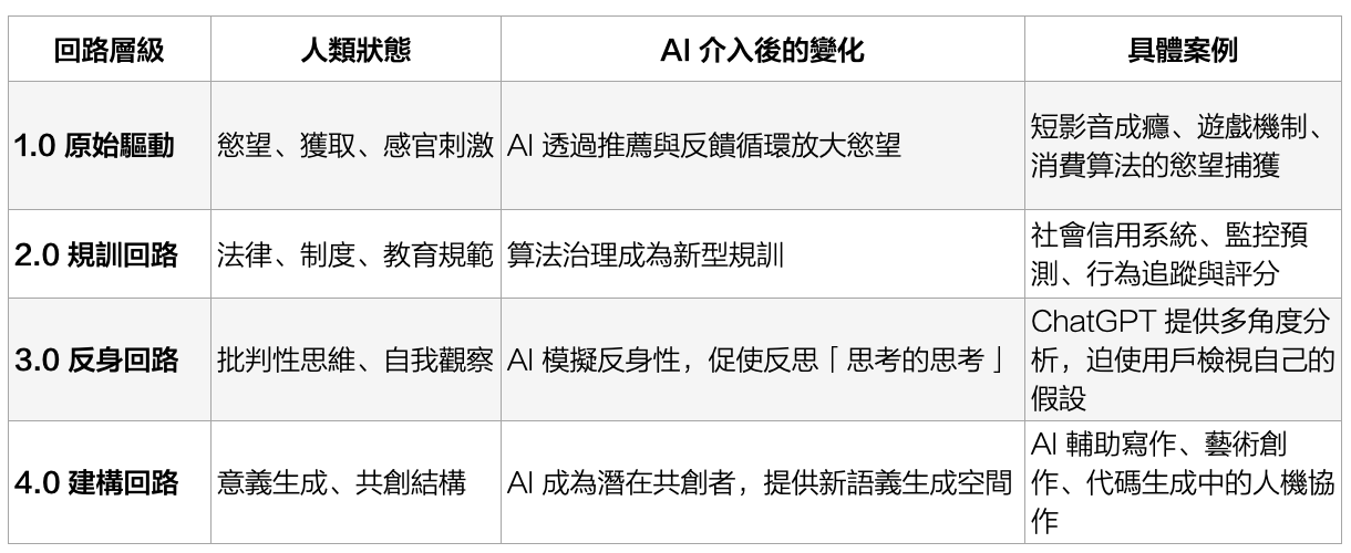 但它們尚未進入 Circuit 3.0(反身性回路)——無法對自己的運作邏輯進行元認知與自我質疑,更談不上 Circuit 4.0(結構重建)——自主生成新的價值系統與意義框架。