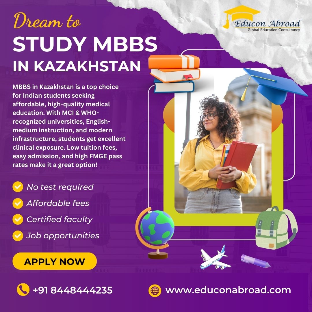 Pursue MBBS in Kazakhstan at WHO & NMC-approved universities with affordable fees and world-class education. Enjoy English-medium courses, top medical training, and easy admission. Secure your seat now and build a successful medical career!