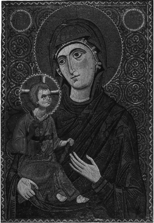 (图二,埃及圣凯瑟琳修道院的圣母与圣子图,自Wikipedia/K. Weitzmann: “Die Ikone”。和后来,在伊斯兰帝国与基督教帝国冲突后的情况不同,早期穆斯林看起来是更加认同于基督徒的。早期的一部穆圣传记说,穆圣在移除克尔白的偶像的时候,留下了一幅尔萨[基督]和麦尔彦[玛丽]的画像;当然这遭到了后来穆斯林学者的驳斥。[伊本·希沙姆IbnHisham, p. 552])