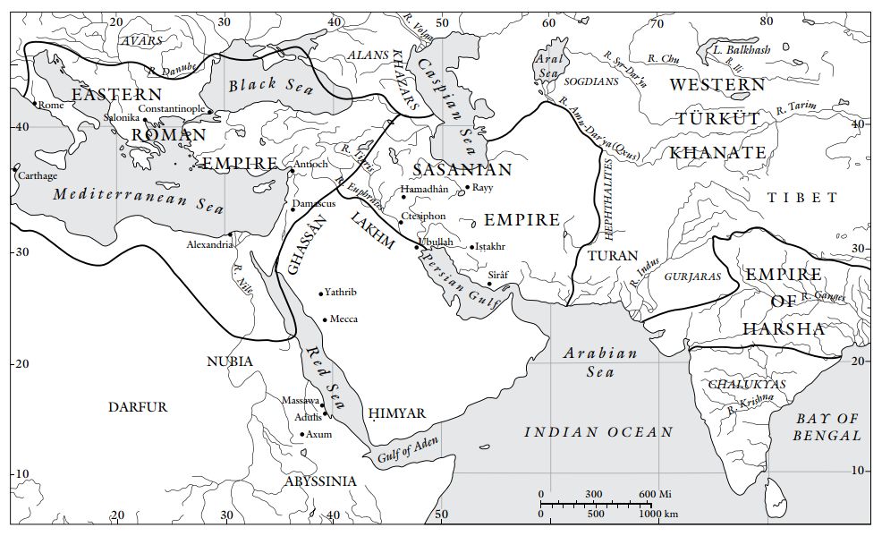 在六世纪末的时候,统治麦加的是古莱氏部落,先知就出生在这个部落。阿拉伯半岛上的部落,无论定居还是游牧,都不为某种政体所统一,也不受什么共同的权威的统治。在数个世纪里,形形色色的权力,包括拜占庭人、波斯人、和埃塞俄比亚人,都为确保他们的利益,而进入过半岛。相互交战的拜占庭和波斯帝国,时不时地也会利用在半岛北部生活的游牧部落民,来保护和扩张它们的边界。它们给这些部落金钱、荣誉的头衔、和其他激励,而尽管帝国们做出了最好的霸权的努力,但这些部落依然反复无常,倾向于在觉得对自己有利时,就改旗易帜。[1]六世纪时,半岛最东边的也门,在中央权威倒台后,就发生了多次权力的斗争。阿比西尼亚(埃塞俄比亚)的基督教统治者(“尼加斯”)派军队推翻了迫害基督教徒(后来的穆斯林学者认为,古兰第八十四章[原文有误,应是古兰十二宫章85:4,“愿掘坑的人们,被弃绝,那坑里有燃料点着的火,当时,他们坐在坑边,他们见证自己对信士们的罪行”,塔巴里等学者认为,这里指的就是犹太统治者杜·努瓦(Dhu Nuwas)对纳季兰基督徒的迫害。——译注]中所纪念的)的犹太统治者。[2]东非对阿拉伯半岛南部的霸权持续了半个世纪,直到波斯萨珊人的到来(图一)。[3]