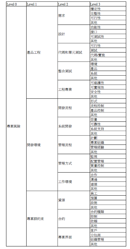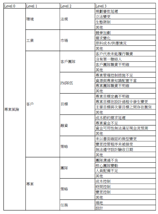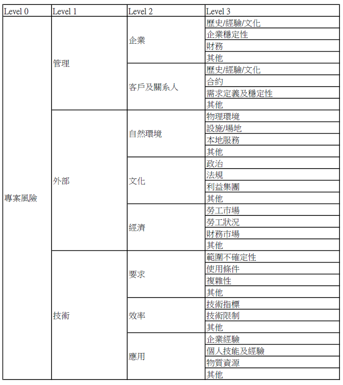 接下來,我整理了 David Hillson 在報告中提出的一些 RBS 範例。各位專案管理者可以將這些範例視為起步的「種子」,以此為基礎進行剪裁與客製化,發展出最適合你們團隊的風險分解結構。