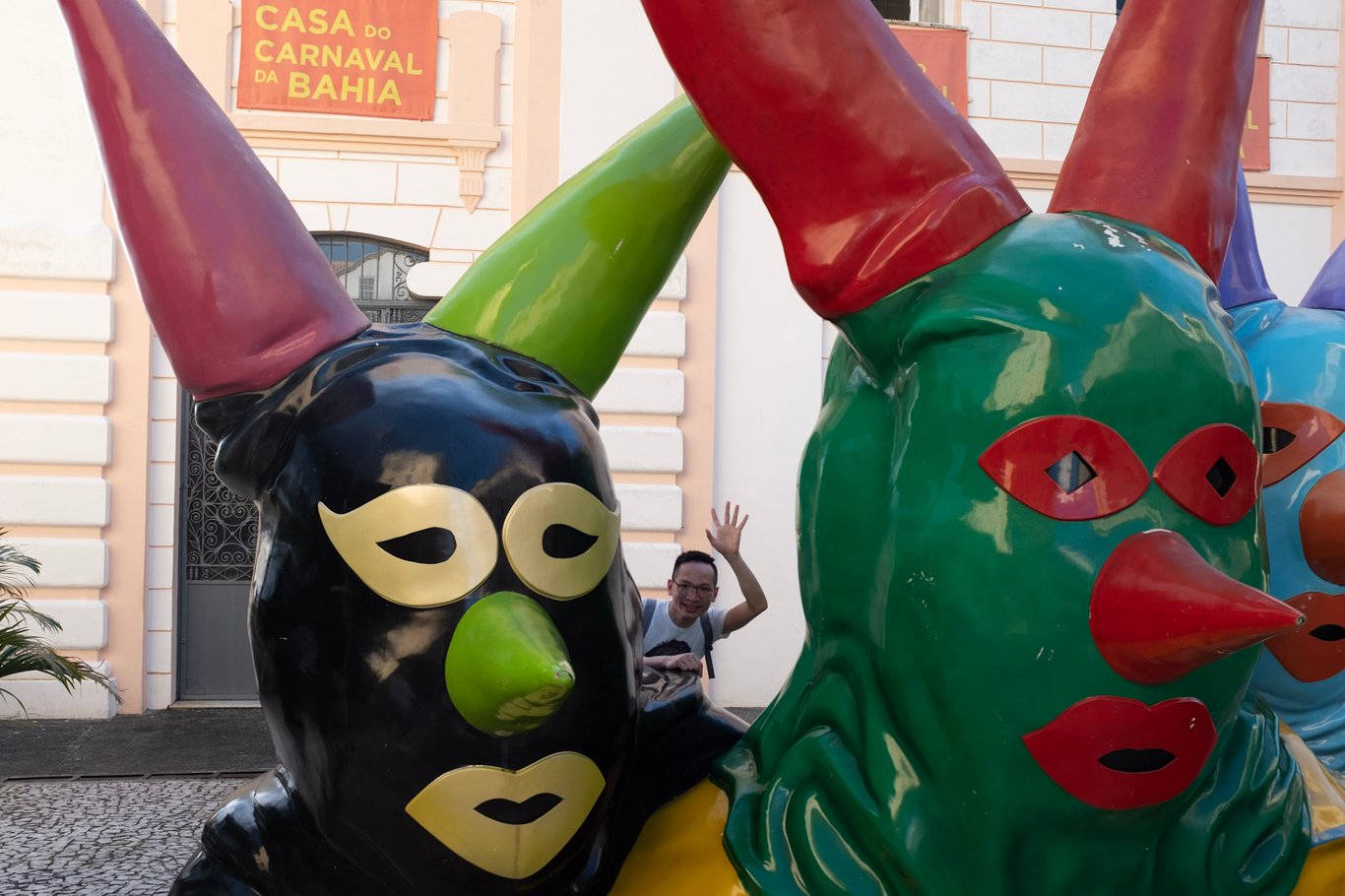 Casa do Carnaval da Bahia巴伊亞狂歡節博物館今日免費。 進得館內,各頻道裡迴圈播放不同的節目,有歌星和名人歷年在花車上巡遊的珍貴片斷,當然不會缺少我的卡耶塔諾。 我遇見他頭像的燈牌,終於有機會跟「本尊」合了影。 昨天遊覽聖阿馬魯,那兒本來有他形象的牆畫,我身臨小鎮來去匆匆,已完美錯過。