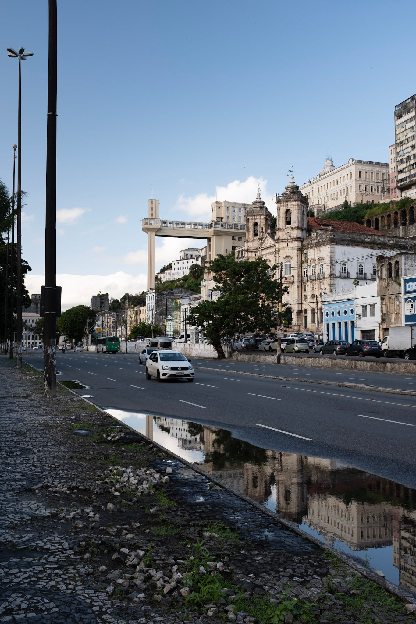 照我的安排,大家開始步行去地圖顯示走路要20分鐘的Elevador Lacerda拉塞達電梯。 有一段路線選得不好,實地走著,發現只能緊貼並無人行道的大路邊緣前進,同方向的汽車摩托車風馳電掣,我直擔心會發生飛車搶奪。但錯有錯著,這路線給我們提供了一個從「低城」欣賞建築的完美視角,帶有別樣的景致,比如雨後的水窪里倒映著的老房子和拉塞達電梯。