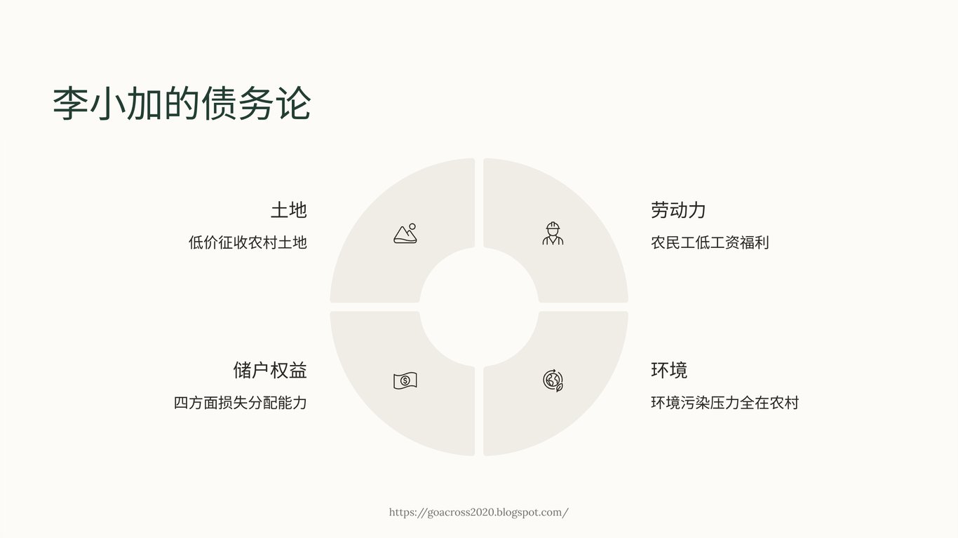 引用李小加讲话,提出中国需要“偿还四笔债”,强调财富再分配与农村消费潜力。