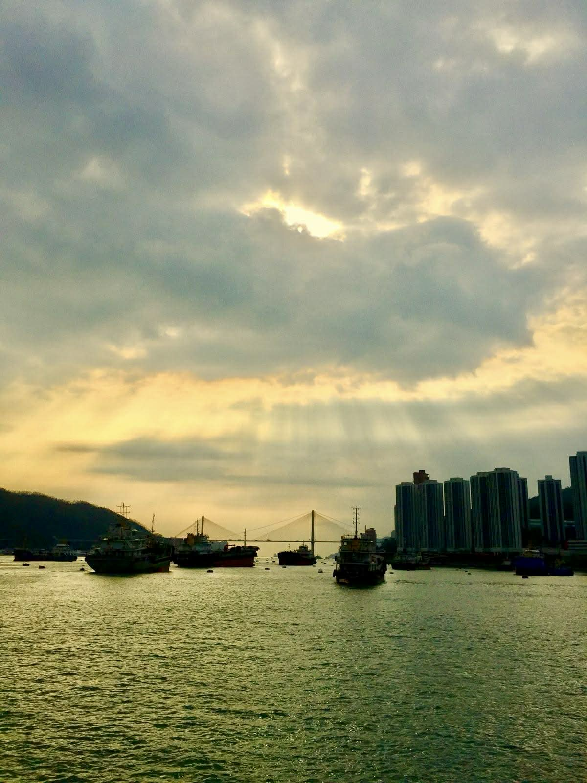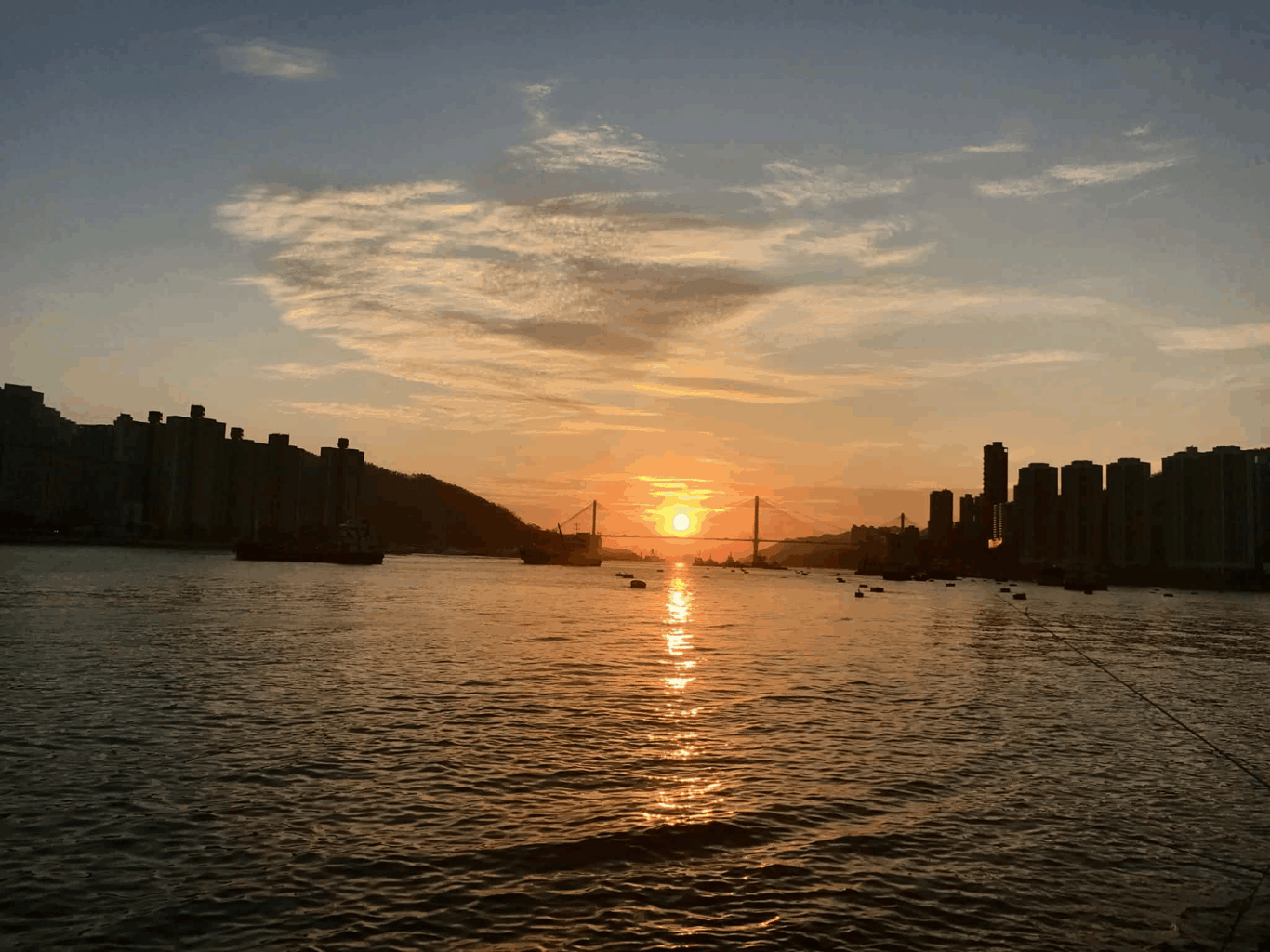 乘港鐵至荃灣西站然後出站離開,轉眼就已經來到海傍(海濱長廊)的位置。在等待斜陽的期間偶爾看看兩旁專注釣魚的路人和全速奔跑的小狗,接著又抬頭欣賞偶爾被雲朵掩蓋的太陽和色彩不斷變化天空,很是寫意舒暢。